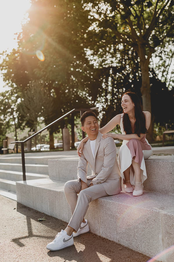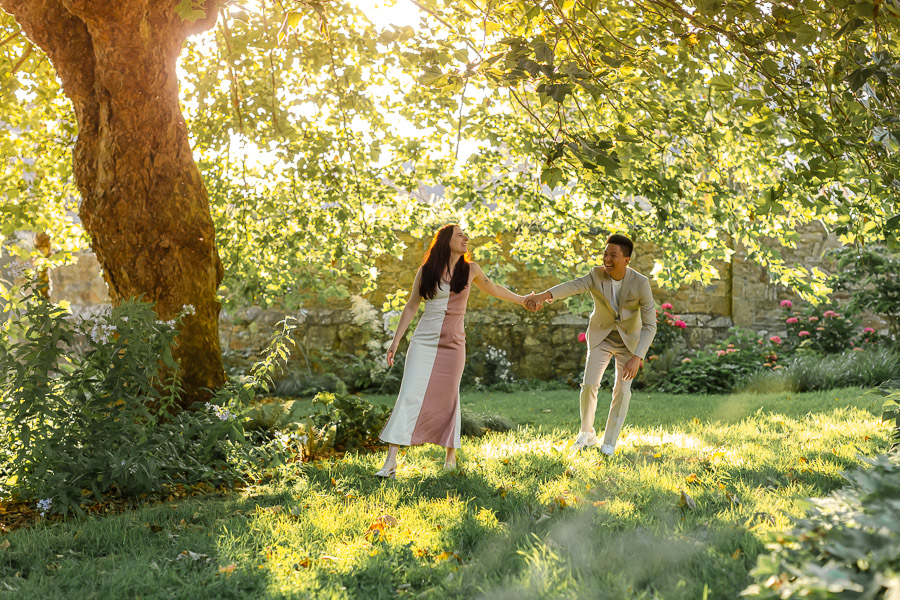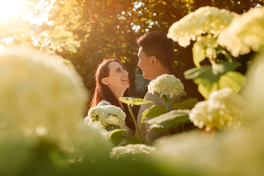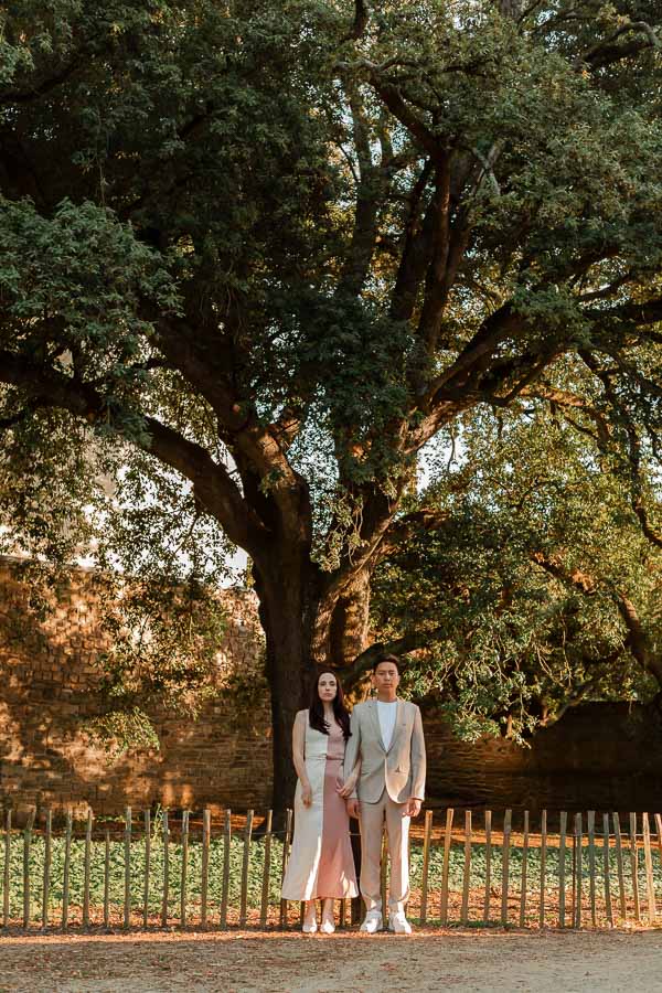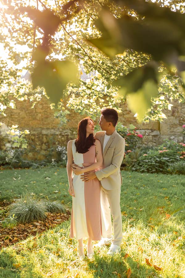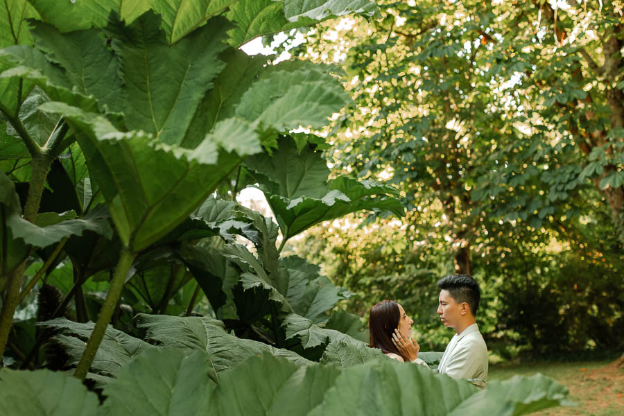 Nous avons ensuite rejoint un parc arboré, aux plantes exotiques, avec une lumière qui se filtrait délicatement à travers les feuillages. L’ambiance y était très différente : plus végétale, presque tropicale, tout en restant chic et moderne. C’était fleuri, romantique, très doux, avec de superbes contre-jours. Un arbre majestueux est devenu un point fort de la séance.